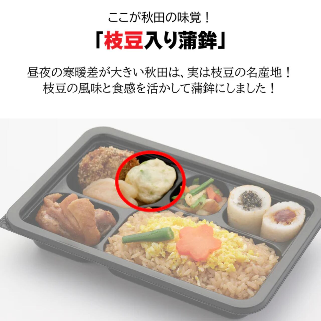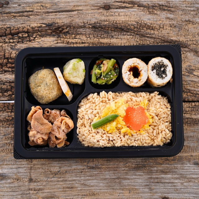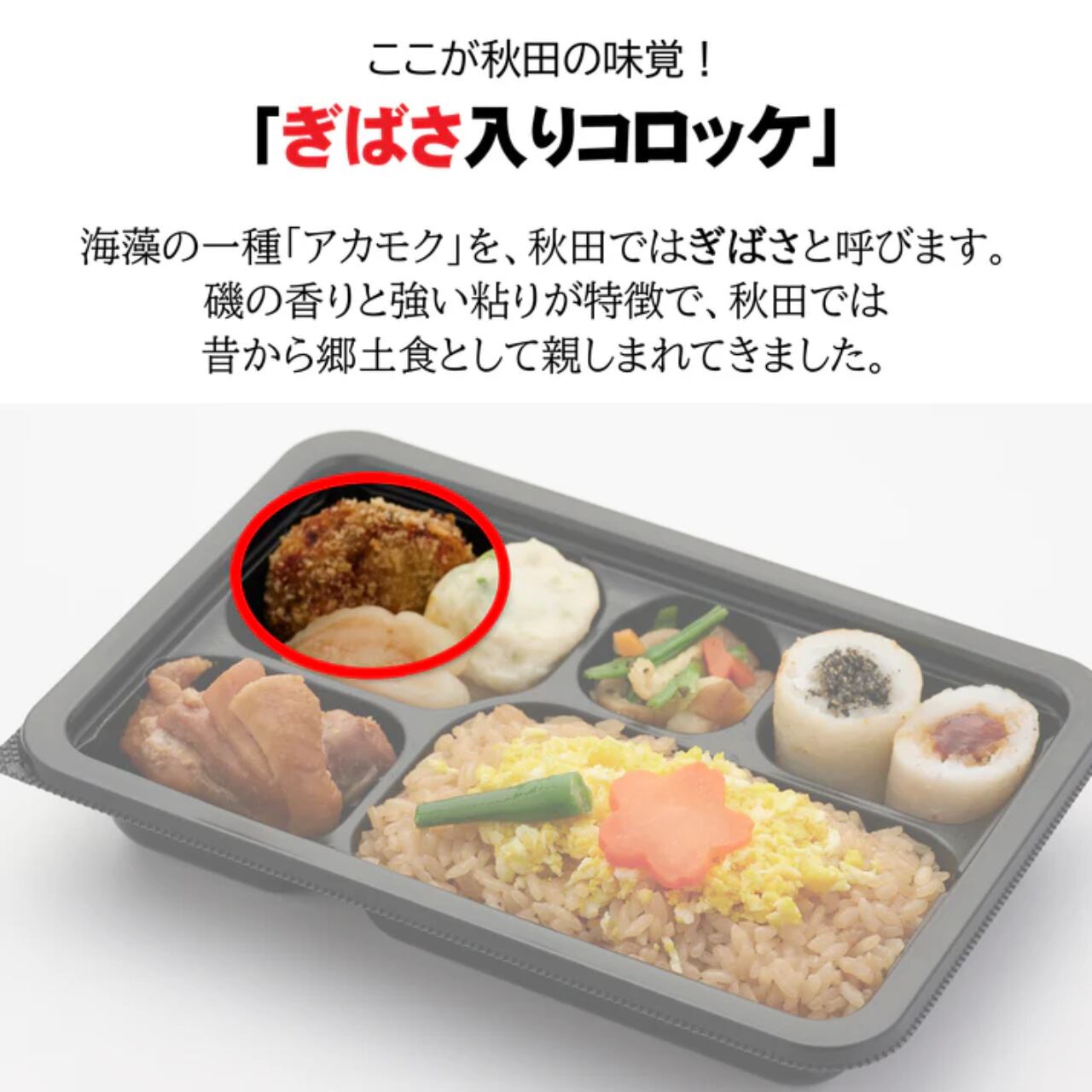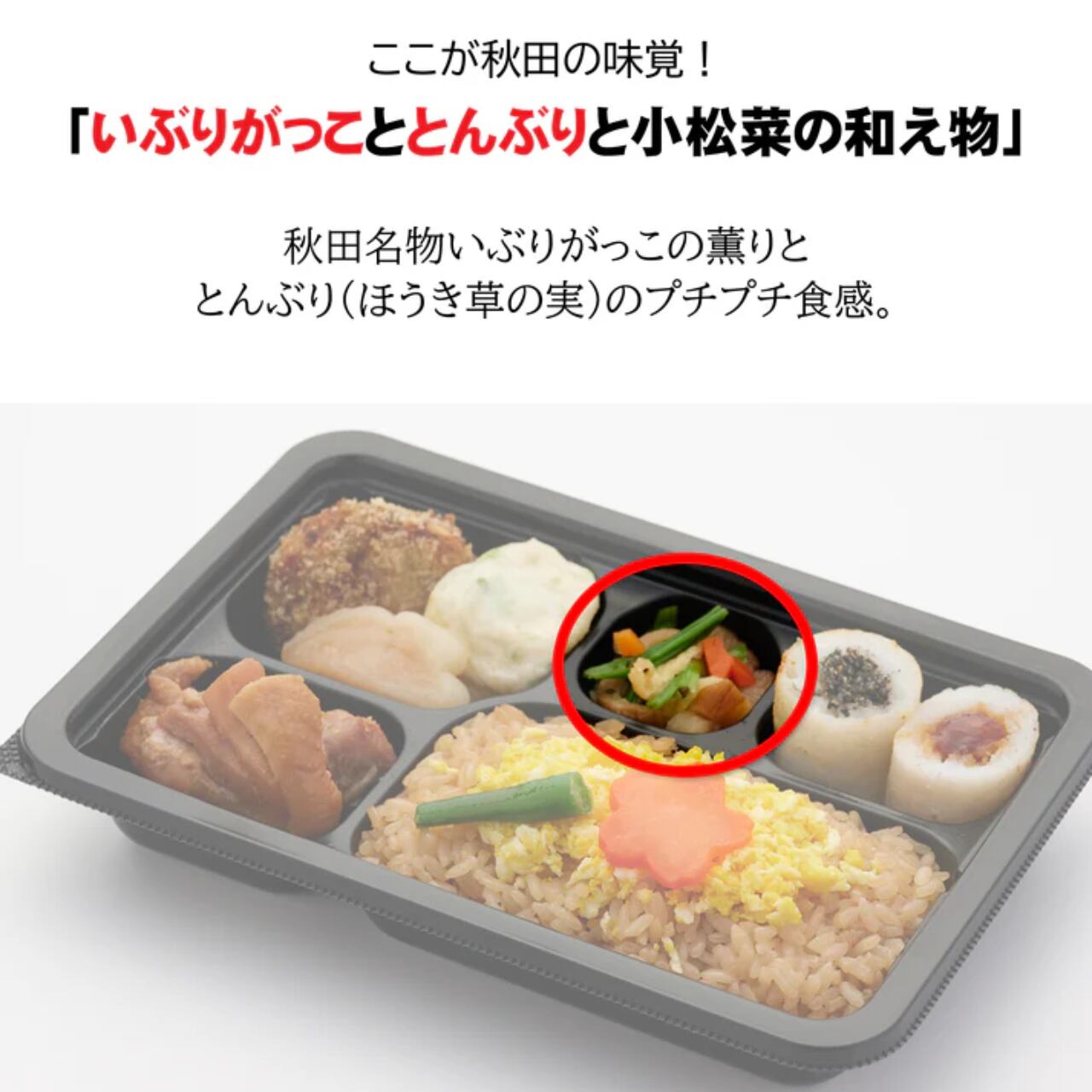 味付けご飯(米(国産)、鶏肉の煮汁)、鶏肉(国産)の甘辛煮、味噌たんぽ、ゴマたんぽ、ギバサ(アカモク)入りコロッケ、枝豆入り蒲鉾(枝豆(国産)、魚肉(たら、吉切サメ)、豆腐、その他)、そぼろ卵、かまぶく、小松菜といぶりがっこととんぶりの和え物、飾り人参、インゲン、植物油、醸造酢/調味料(アミノ酸等)、トレハロース、pH調整剤、グリシン、酒清、糊料(加工でん粉、増粘多糖類)、酢酸Na、乳化剤、香料、酸味料、(一部に鶏肉・卵・乳成分・小麦・大豆・ごま・りんごを含む)