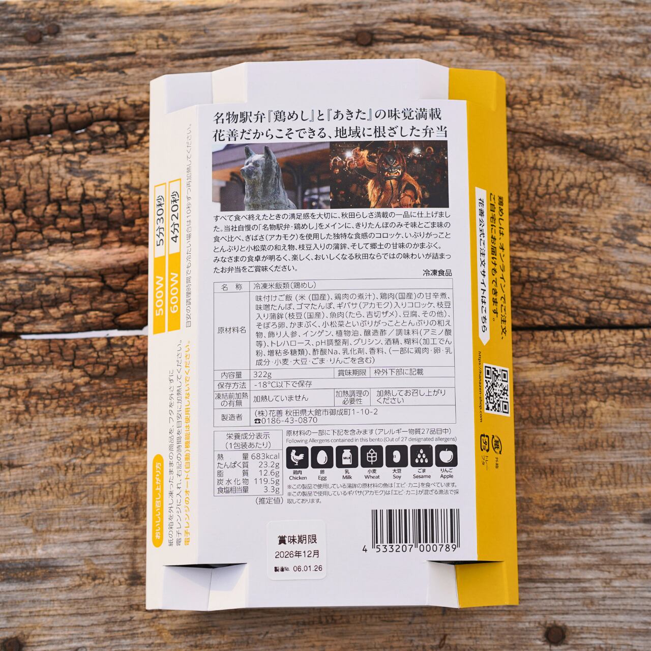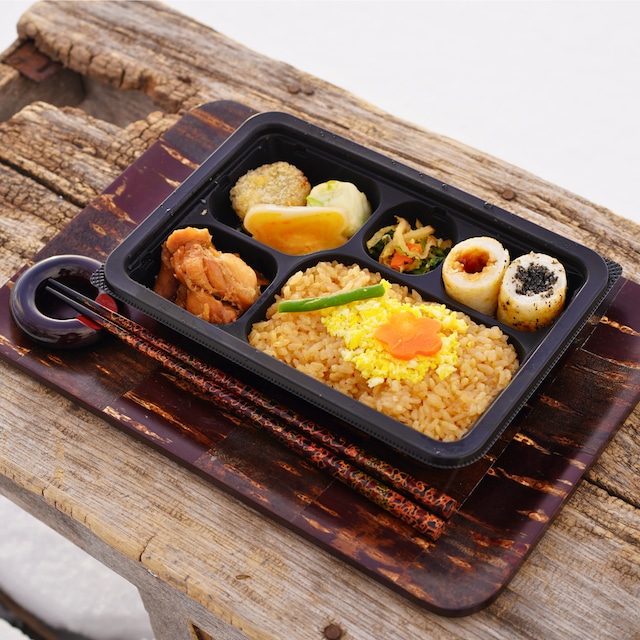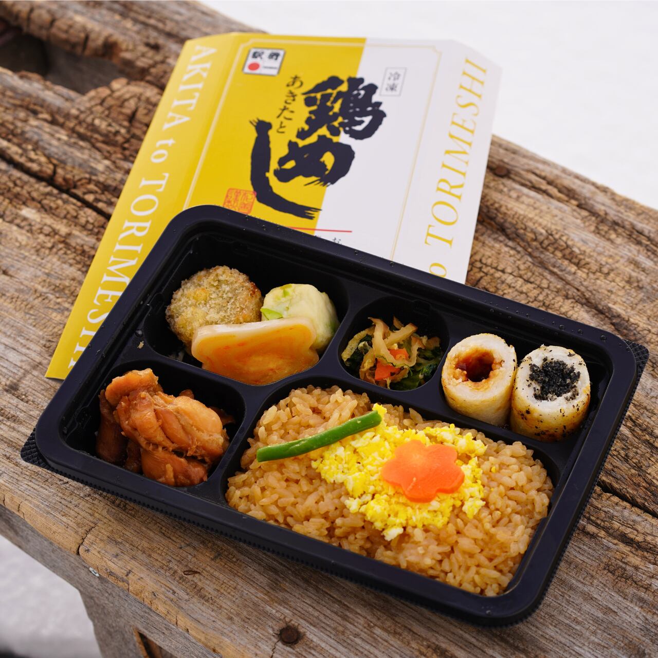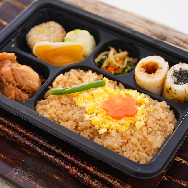 味付けご飯(米(国産)、鶏肉の煮汁)、鶏肉(国産)の甘辛煮、味噌たんぽ、ゴマたんぽ、ギバサ(アカモク)入りコロッケ、枝豆入り蒲鉾(枝豆(国産)、魚肉(たら、吉切サメ)、豆腐、その他)、そぼろ卵、かまぶく、小松菜といぶりがっこととんぶりの和え物、飾り人参、インゲン、植物油、醸造酢/調味料(アミノ酸等)、トレハロース、pH調整剤、グリシン、酒清、糊料(加工でん粉、増粘多糖類)、酢酸Na、乳化剤、香料、酸味料、(一部に鶏肉・卵・乳成分・小麦・大豆・ごま・りんごを含む)