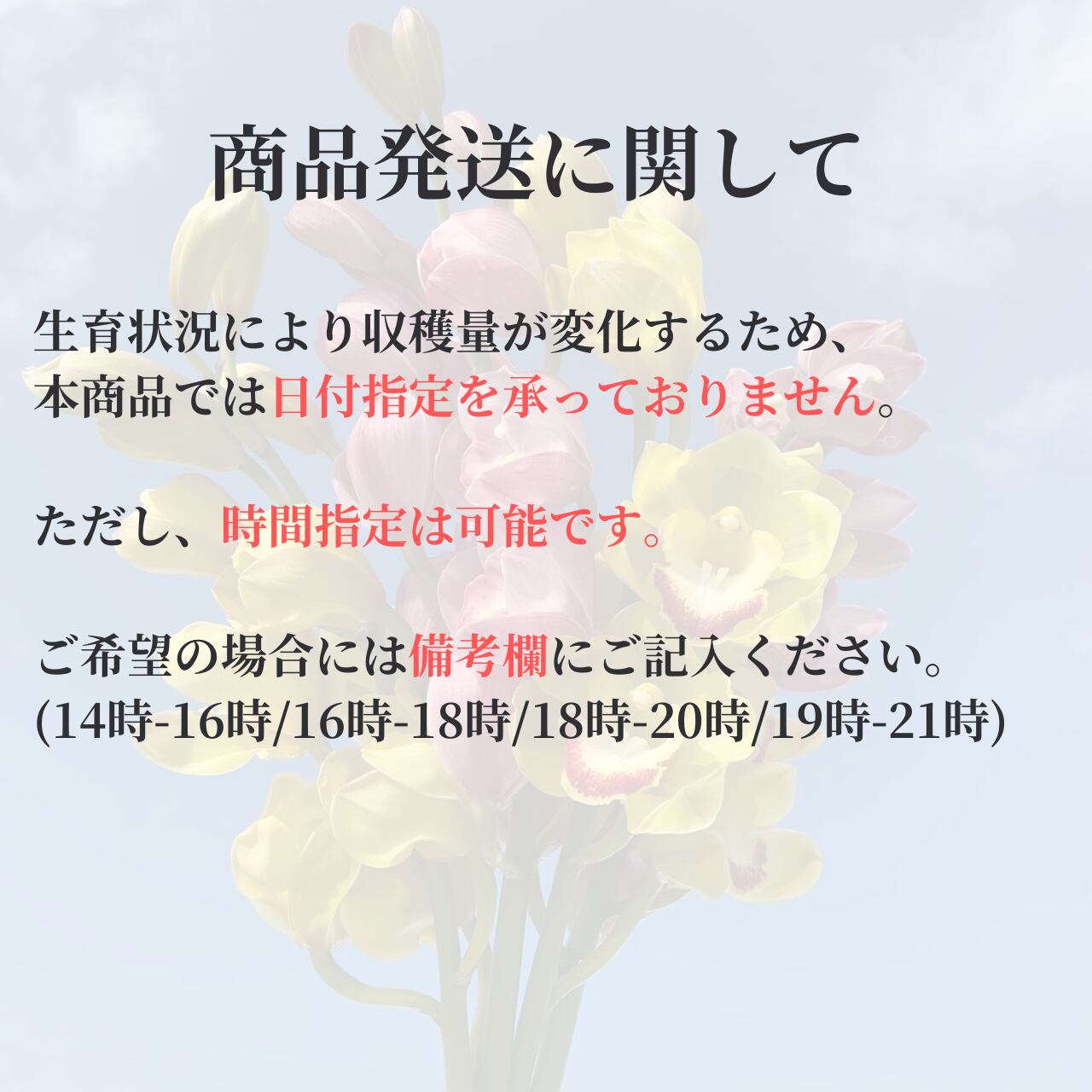 ・生育状況により収穫量や品種が変化するため、誠に申し訳ありませんが本商品では日付指定を承っておりません。ご不便をおかけしますがご了承くださいませ。なお、時間指定は承りますので備考欄にご記入ください。